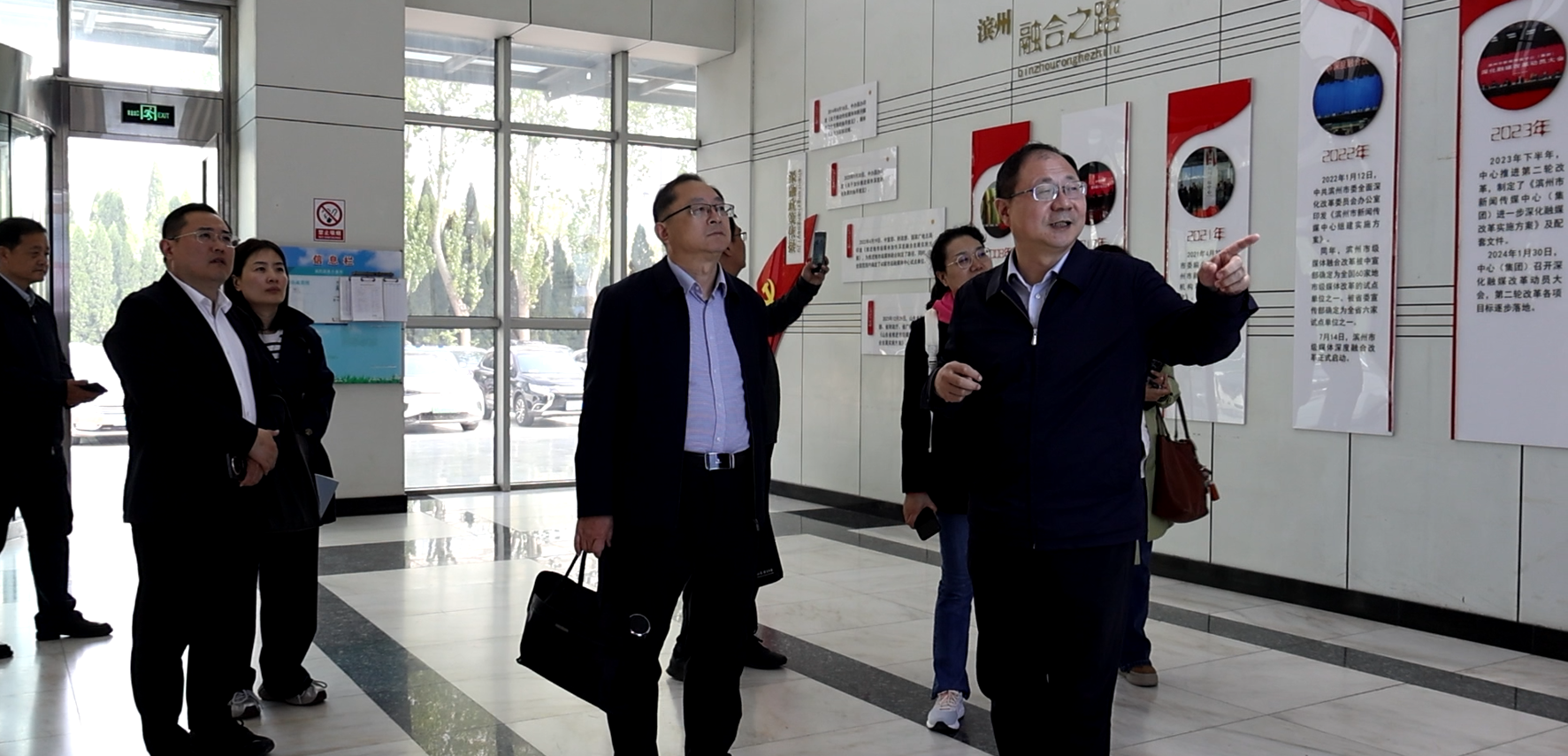 孙文生一行首先在中心(集团)一楼了解滨州媒体融合发展进程及滨州媒体融合“3+1”经验做法,随后参观了一楼演播大厅、数据机房、指挥调度中心、融媒体演播室等地。